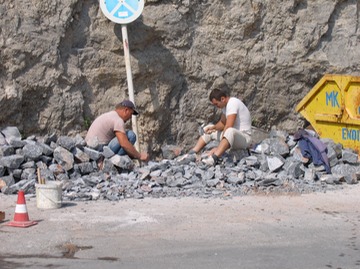 workmen breaking stones - no OSHA here!