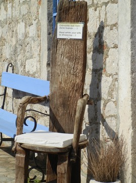 interesting sign on chair outside shop